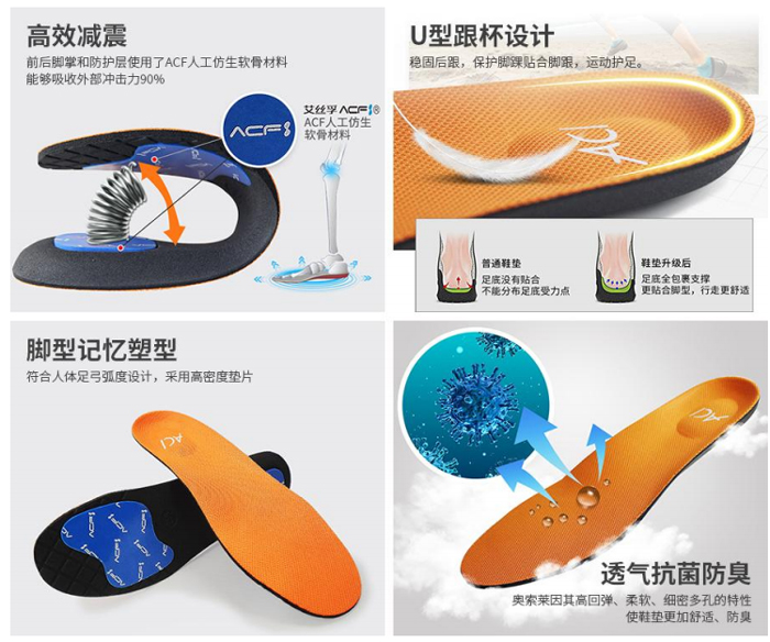 1.高效减震的特点:贴合人体脚骨设计,前后脚掌和防护层使用了ACF人工仿生软骨材料,能够吸收外部冲击力90%;