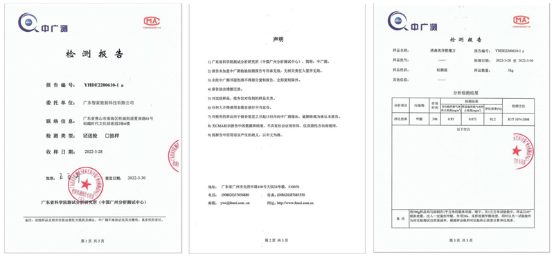 权威检测机构认证:通过广东省科学院检测分析研究所检测,即中广测检测报告,检测效率为24h内除醛效率为92.2%(1立方米实验舱内)。